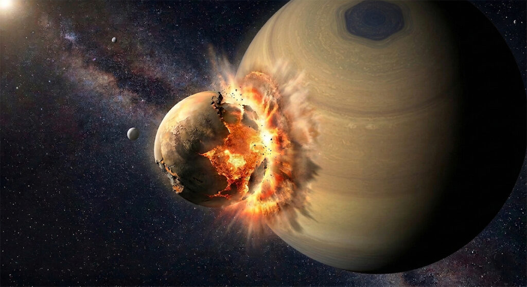 Los investigadores creen que una gran colisión podría conectar todas esas piezas en una sola historia. Sería una especie de explicación general para varios problemas del sistema saturniano.